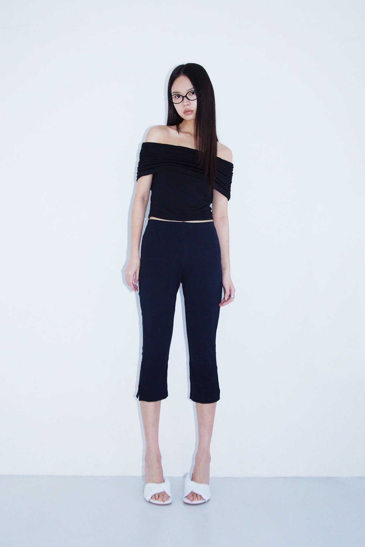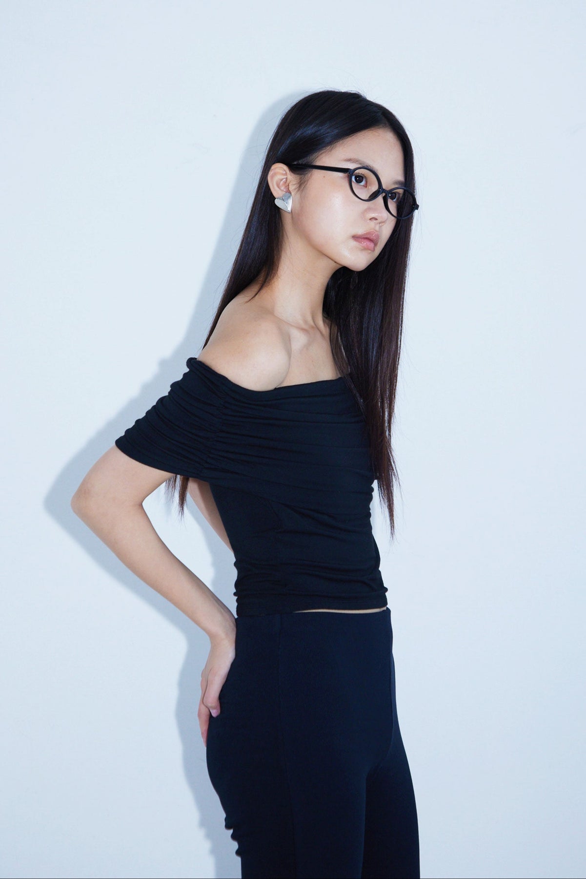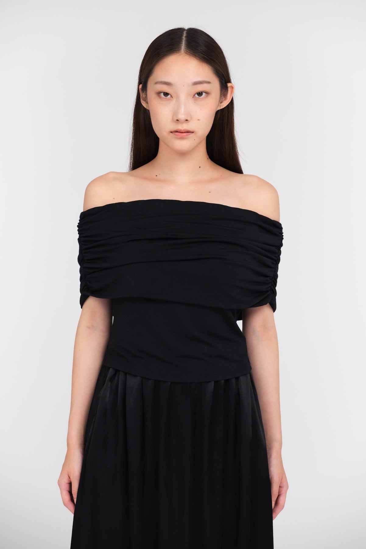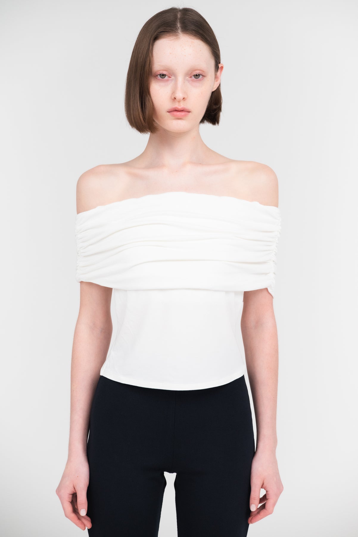 コラーゲンを含んだ生地で仕立てたオフショルダートップ。折り返し部分は袖のサイドにシャーリングを入れることで立体感を表現した。バスト部分にカップ付き。