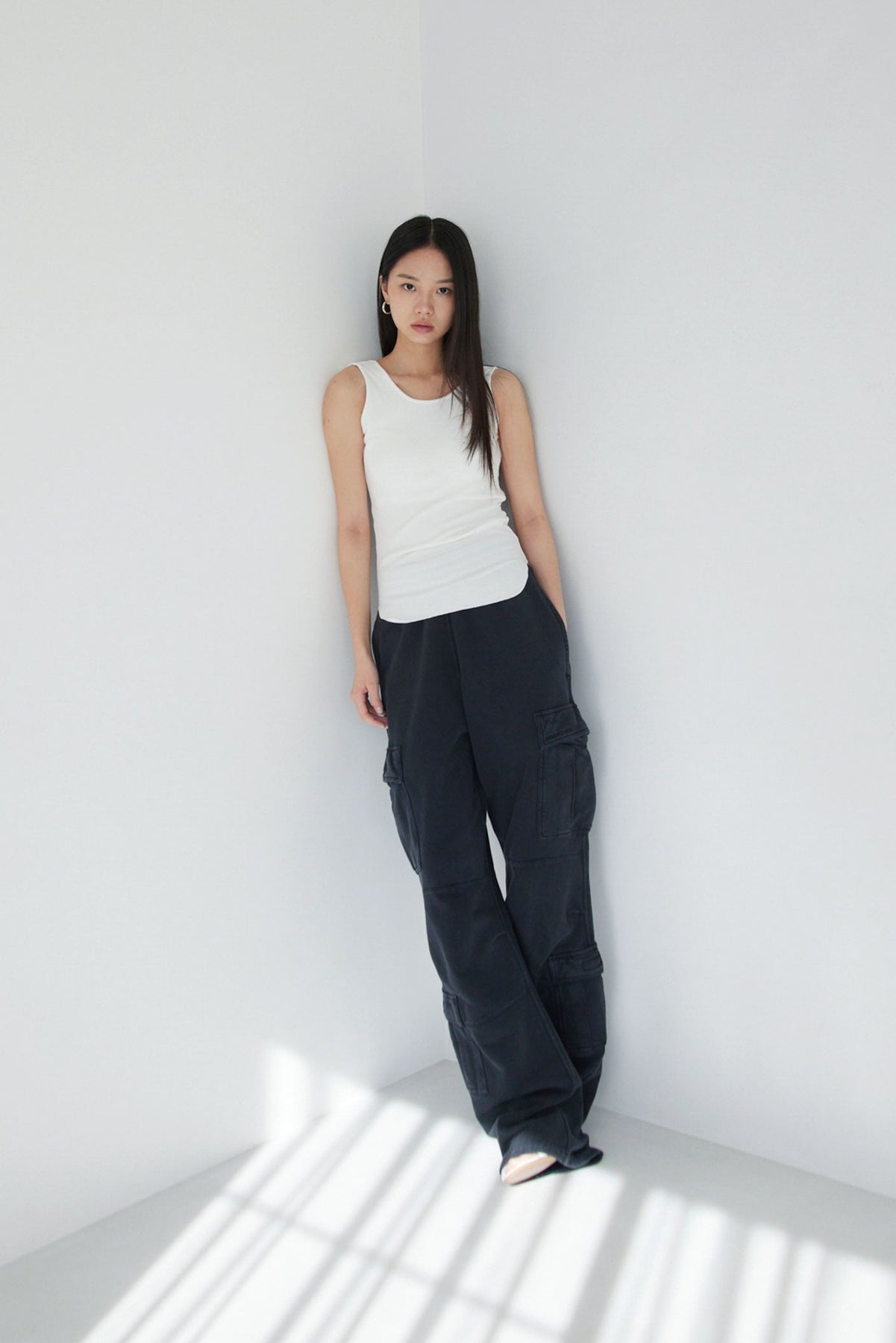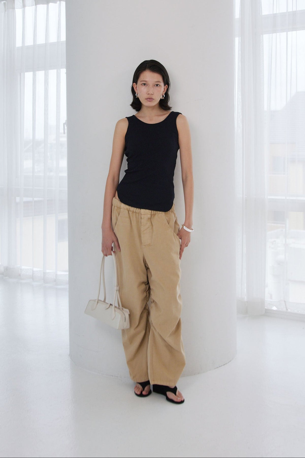 大きく開いたスクープネックがリラックスムードを演出し、裾のラウンドカットは軽やかなアクセントに。