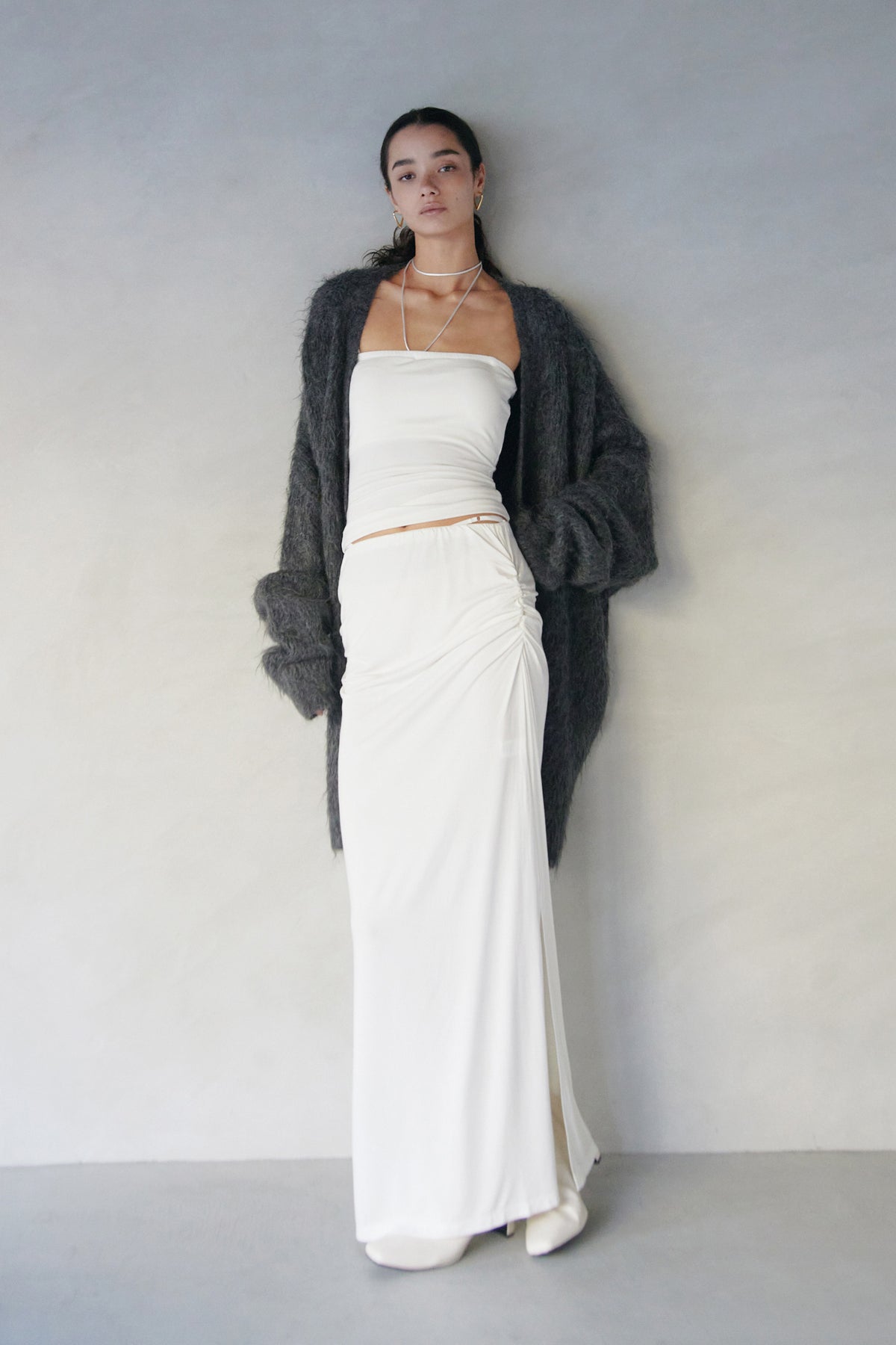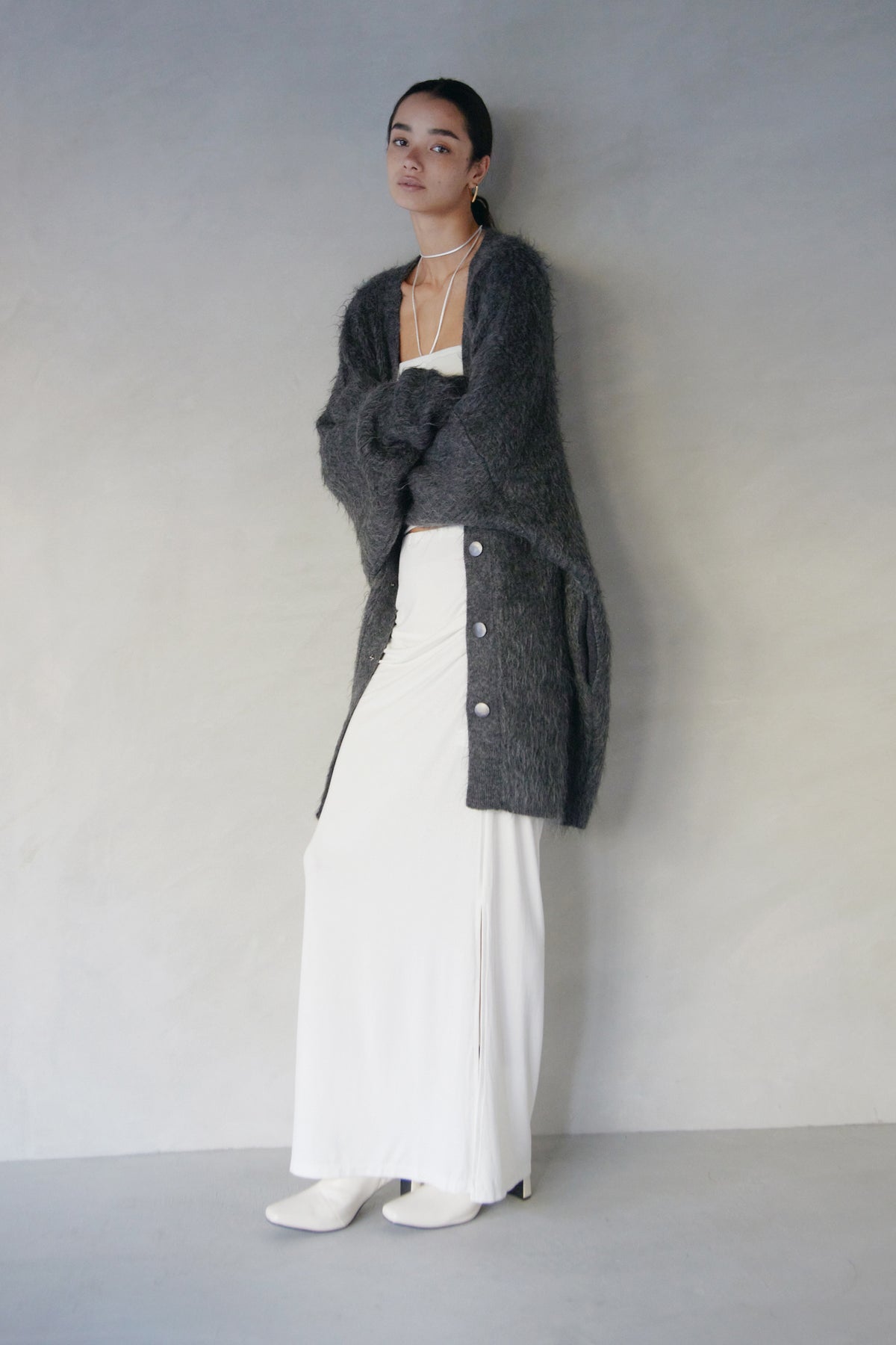コラーゲンを含んだ生地でデザインしたキャミソール。ボトムスインでもアウトでも着られるベーシックな丈感で幅広く使える一枚。取り外し可能なホルターストラップ、同じく取り外し可能なサイドストラップの両方がつき、シーンに合わせてアレンジ性の高い一枚に仕立てた。