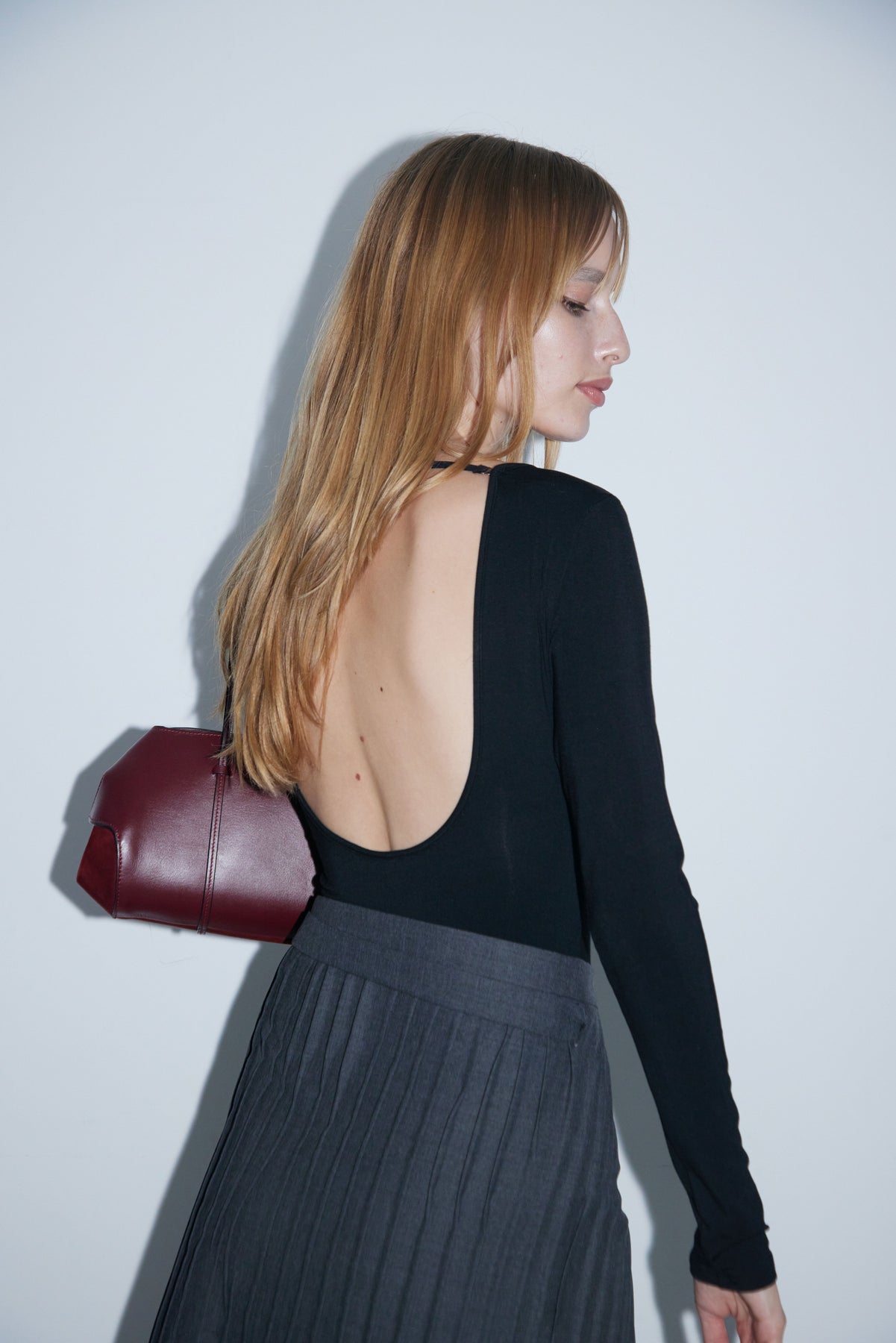 Featuring long sleeves, a modest front opening, and a bold open back design. The back includes adjustable and removable straps to ensure it stays securely in place. Versatile for wearing as both an undergarment and a standalone piece.