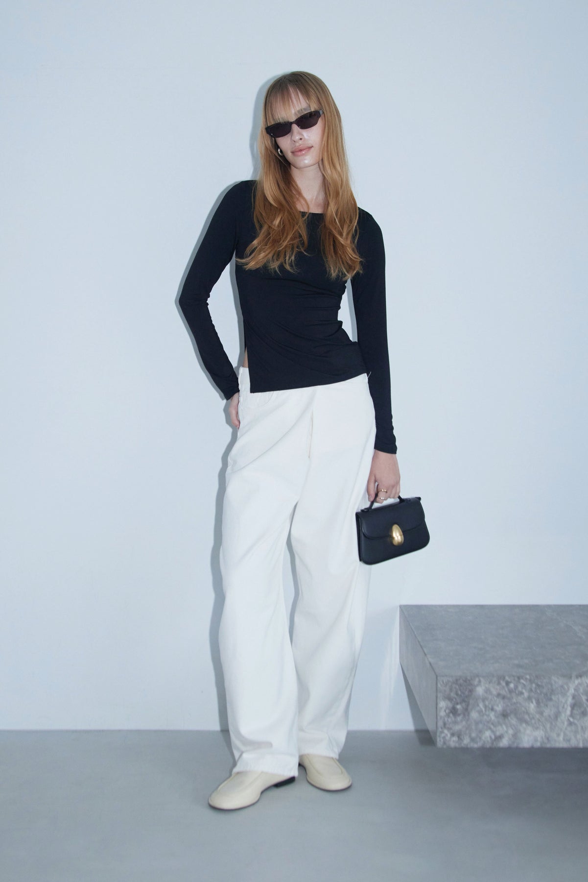 Long-sleeve top made from fabric containing collagen. The boat neck and asymmetrical slit at the hem create a sleek, flattering silhouette. This piece offers a relaxed fit that’s easy to wear without being too tight.